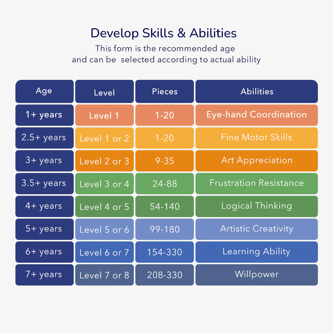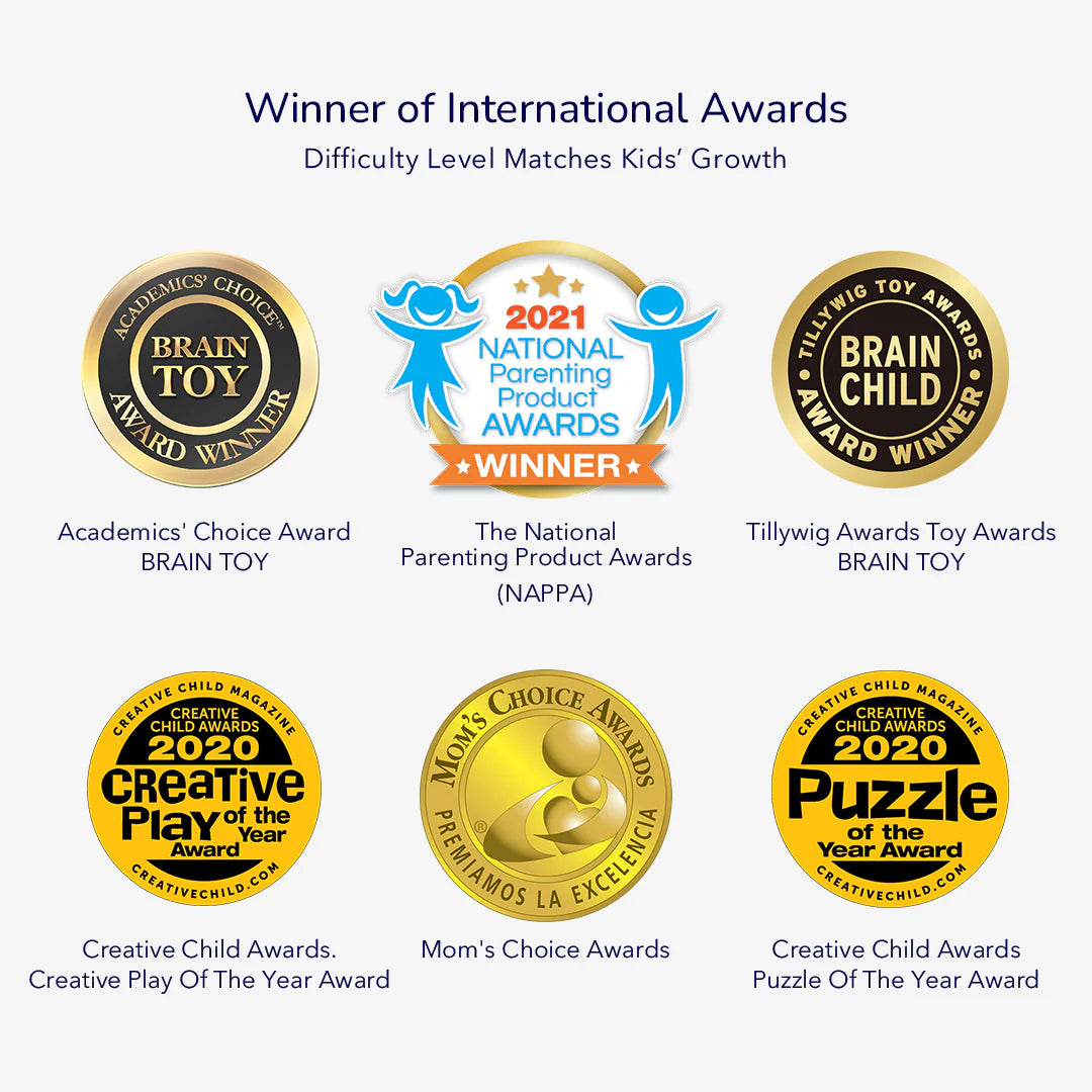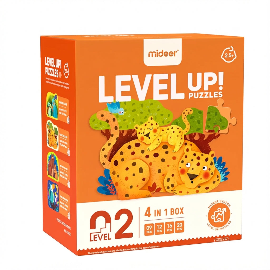 Mideer Level Up! The puzzle series has 8 levels in total. The number of puzzle pieces increases level by level to fit kids’ intellectual development and activate kids’ brains in all aspects. Pictures start from a single animal to complex scenes to enhance the kids’ cognition step by step. Spark kids’ imaginations through various art styles. Smooth & burr-free edges encourage safe hands-on play & learn.