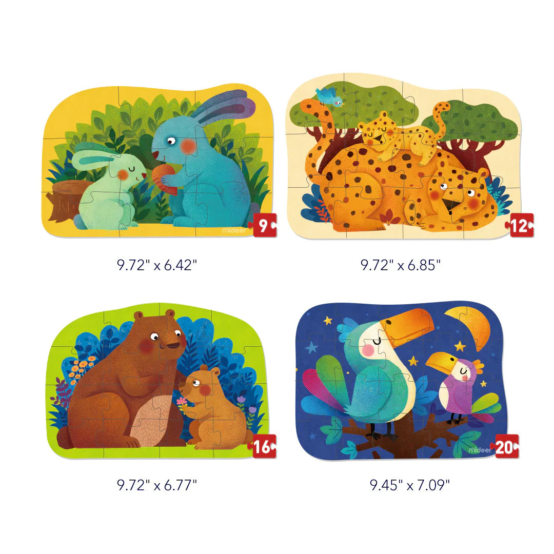 Level 2: Animal Families theme has 4 puzzles in 1 box & features 4 pairs of parent-child animals in the forest, including rabbits, leopards, bears, and toucans.
