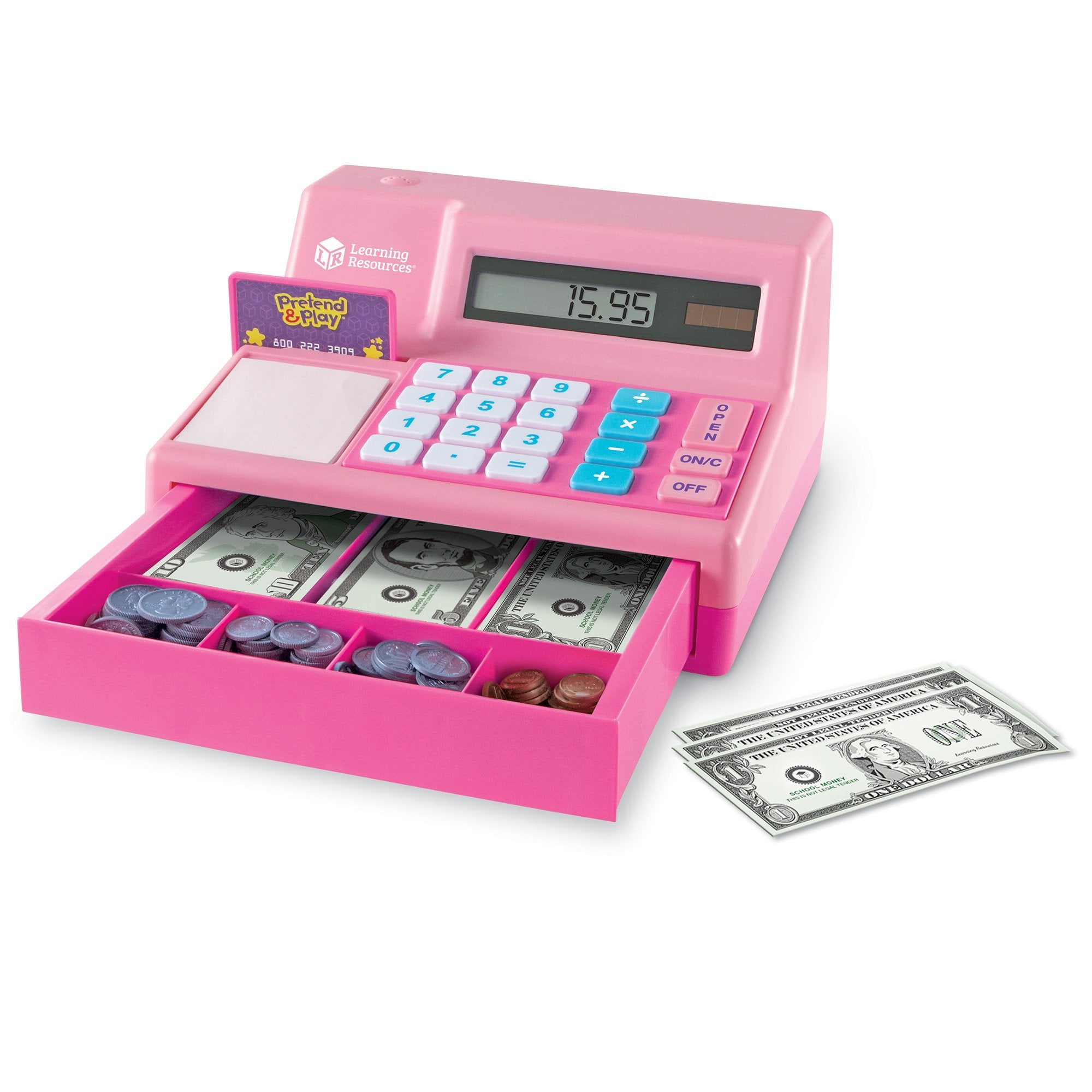 Encourage beginning math and calculator skills while providing lots of opportunities for imaginative play. Children will also learn currency denominations and have fun handling life-size money with this cash register featuring a solar powered calculator.