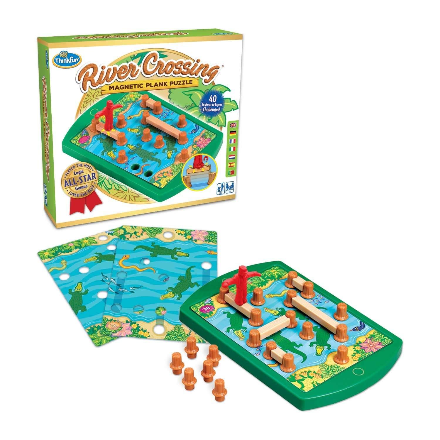 The journey home is a perilous one in this best-selling strategy game. Players begin by positioning tree stumps and magnetic planks on the game board according to pictures on each challenge card. The object is to get their fearless backpacker safely across the alligator- and piranha-infested lagoon by moving the planks between stumps. With an imaginative game design and varying levels of difficulty, River Crossing offers hours of adventure.