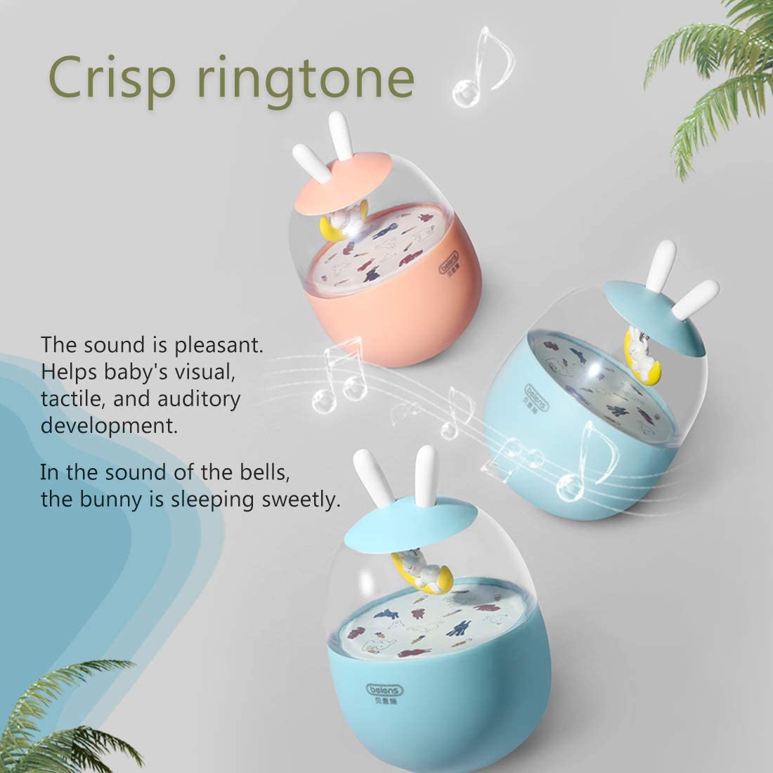 - SOOTHING ROLY-POLY TOY:A light pushing will make the sleeping bunny sway gently inside, accompanied by a soothing tinkling sound with a built-in bell. It can pacify baby and accompany baby to sleep.The moderate volume is designed to protect sensitive young ears