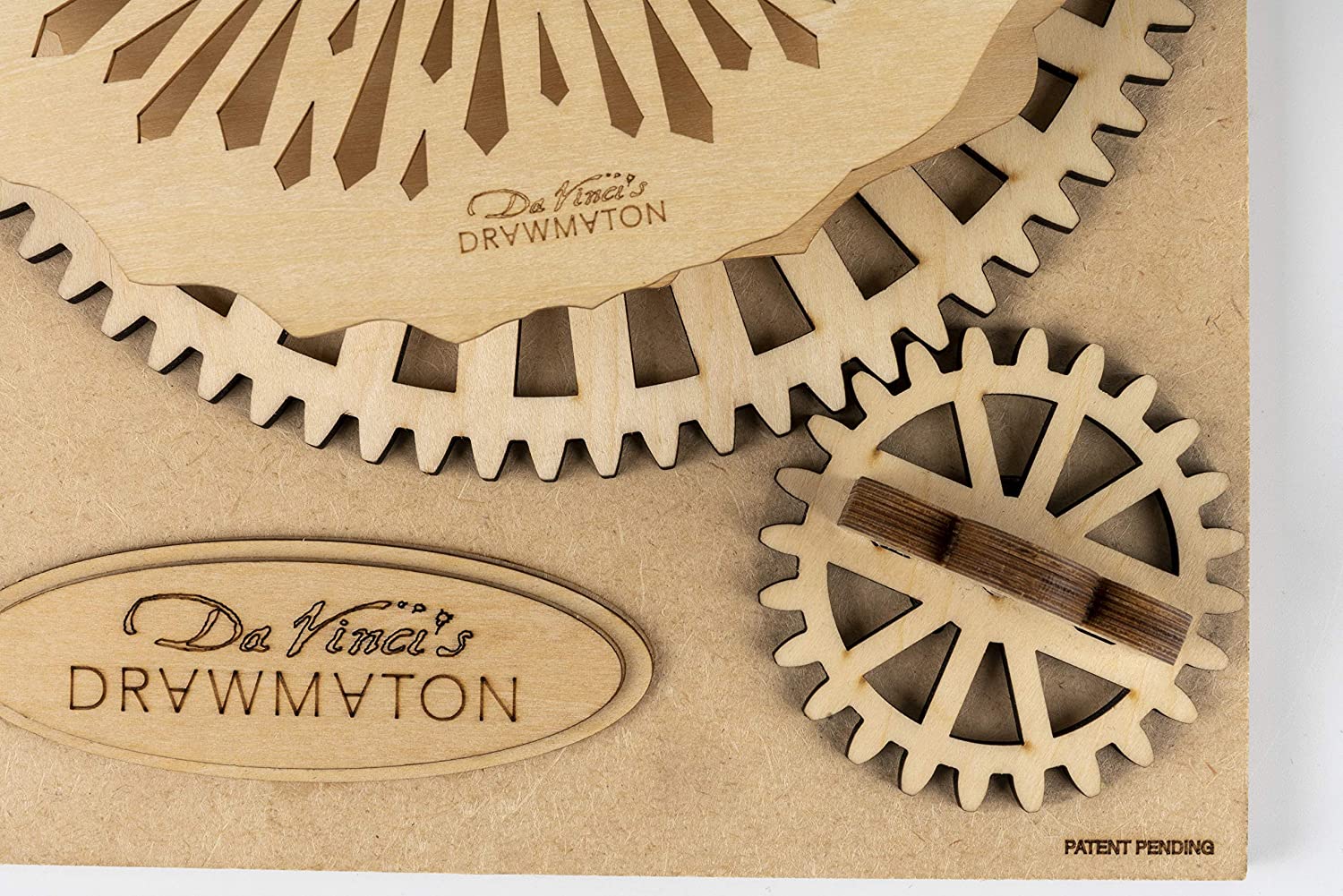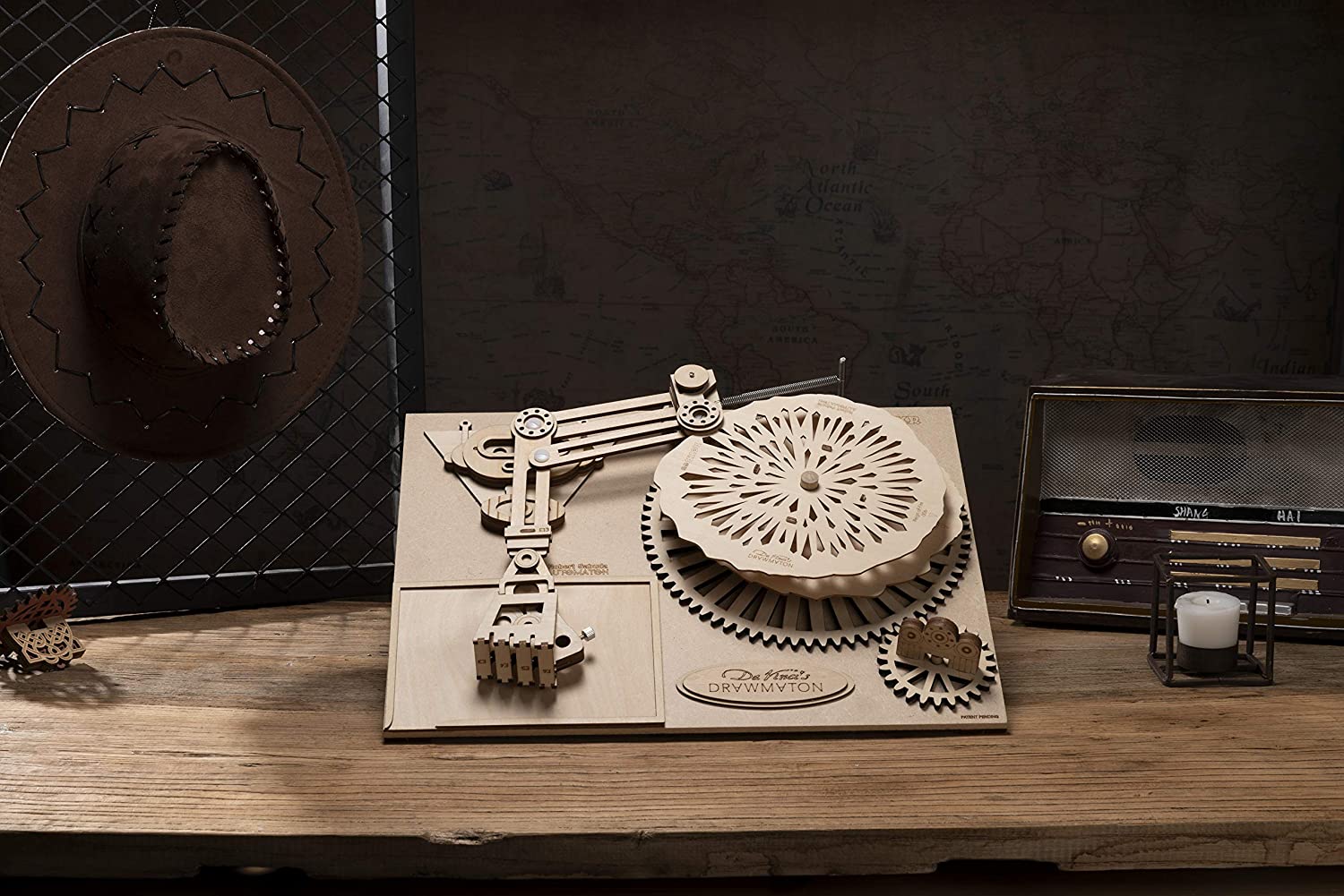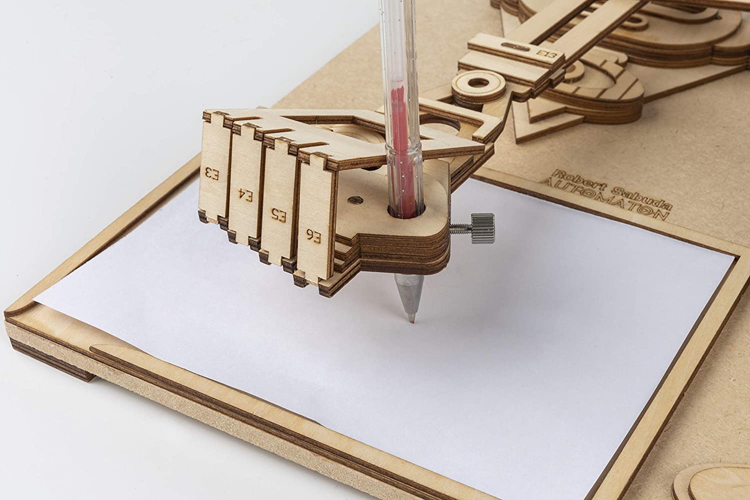 Drawmaton is able to draw different artistic patterns by switching to corresponding gear disk. Crank the handle steadily and an art work comes out gradually under the mechanical robot arm. Put any drawing tool into the Robot's hand, place a piece of paper into the draw area, slowly turn the small gear knob and viola! The Robot draws a single line picture!
