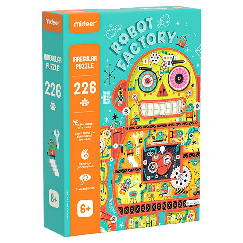 This robot-shaped puzzle features the body structure of a robot, with many small people living inside to support the robot's functions.