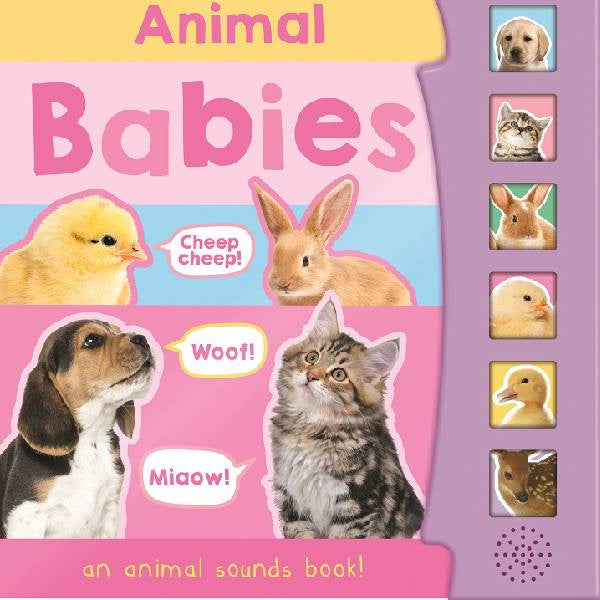 Hear the sounds of baby animals, as you look at their pictures in the book. Photographic imagery.