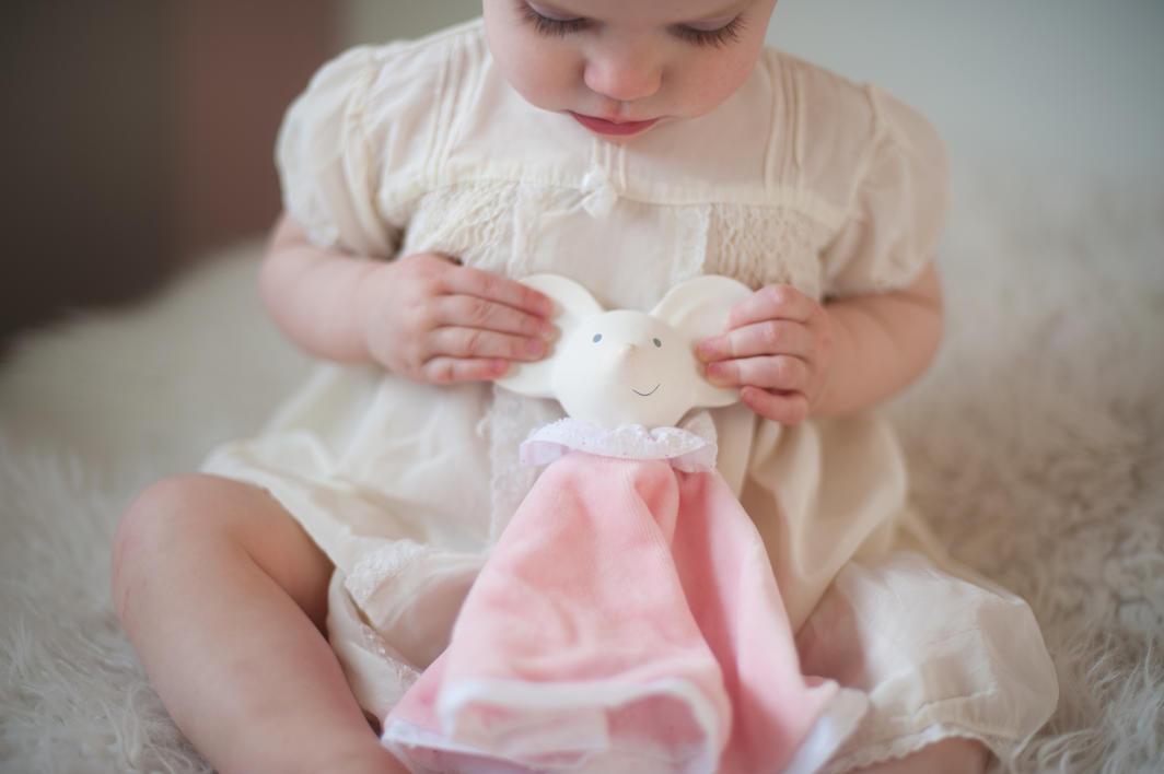 Meiya has an all natural cotton body and a friendly natural rubber character head, sustainably harvested from the Hevea tree, that is ideal for teething. They are made with natural cotton, antibacterial corn fibre and sustainably-produced rubber.