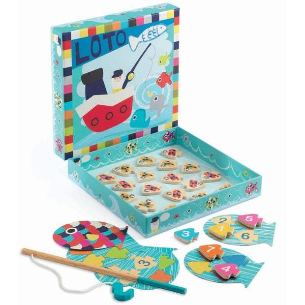 Take the classic magnetic fishing game to a new level with the Djeco Navy Loto Game. Beginners can start by practising their coordination skills and simply catching the little fish with the magnetic fishing rod. Move up to the next level of playing fishing bingo and match the colour of the fish you catch to the colours on your card. The final stage has you matching the number on the bottom of each fish to your card and the first person to match all the colours or numbers wins. Bingo!