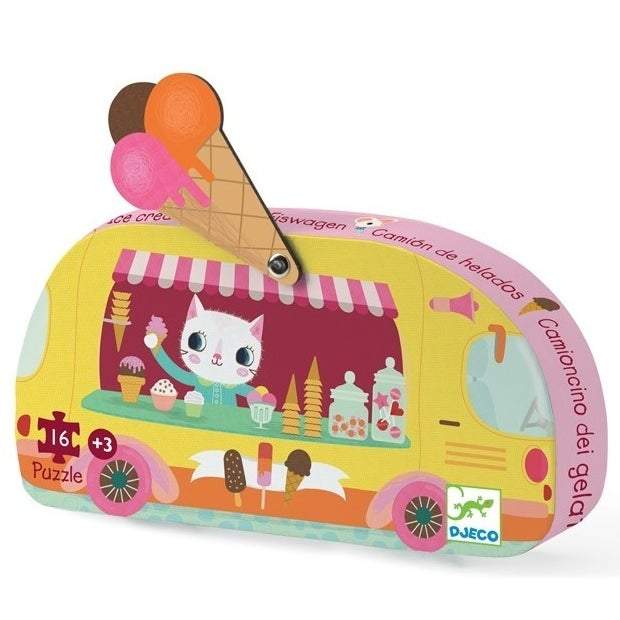 Djeco Puzzle The Ice Cream Truck is a 16 piece jigsaw boxed in a lovely pink and yellow truck shaped box - a fun, pastel-coloured puzzle and a gift that will appeal to young girls 3 years and above.