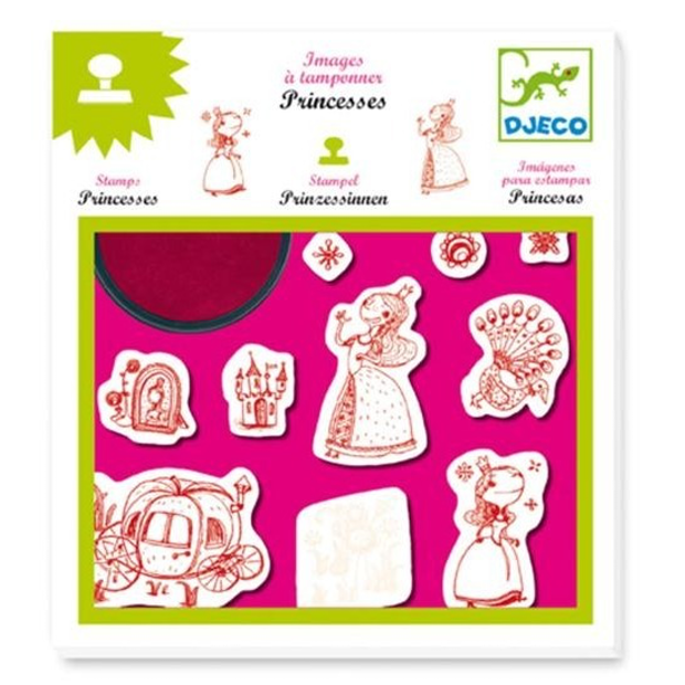A beautifully illustrated stamp craft kit with 10 princess-themed rubber and foam stamps and a large red ink pad. Create adorable princess stories and colourful scenes with these fun stamps, which include 2 princesses, a castle, a peacock, a pumpkin carriage and some flowers.