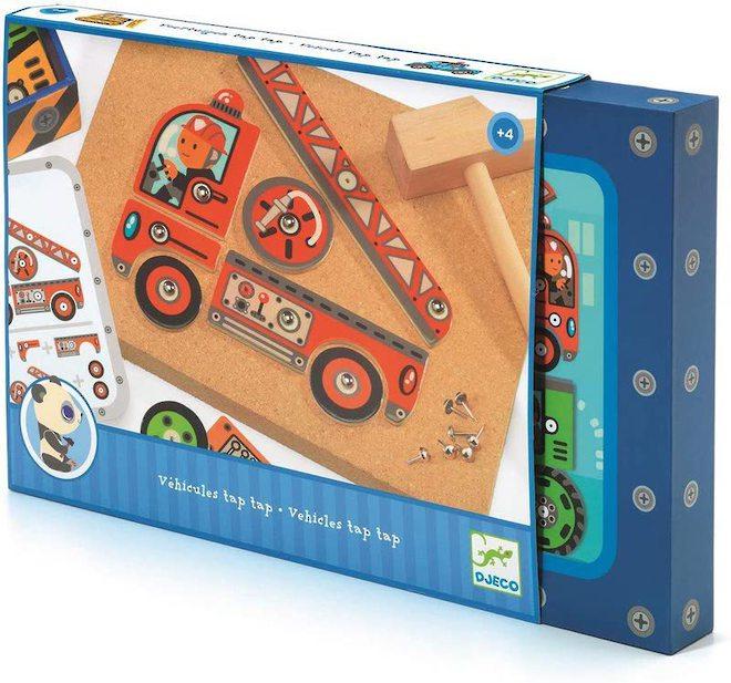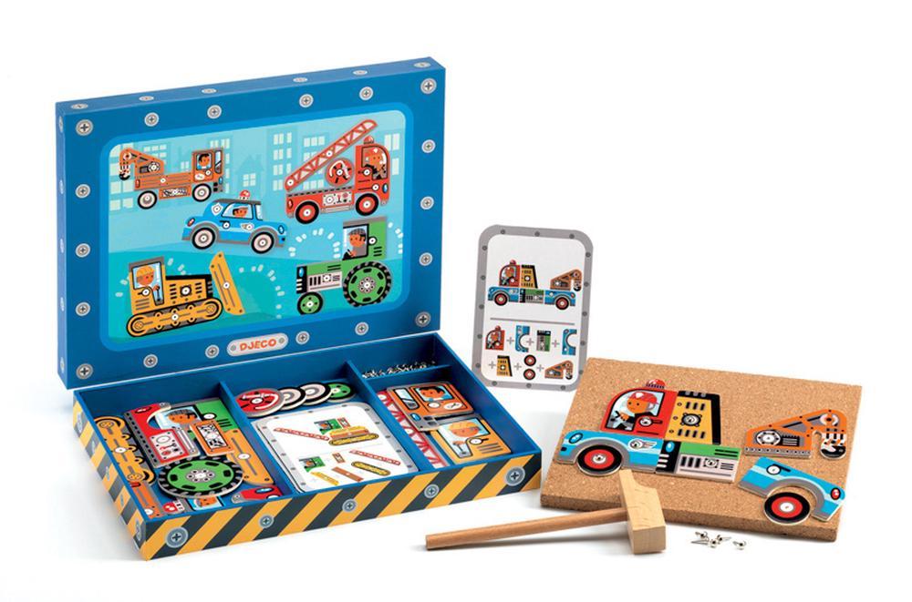 Djeco Vehicles Tap Tap Product made of: Wood & Cork Includes: 1 Cork Board, 1 hammer, 5 instruction cards, approx 40 pegs and wooden shapes Package dimensions: 30 x 23 x...