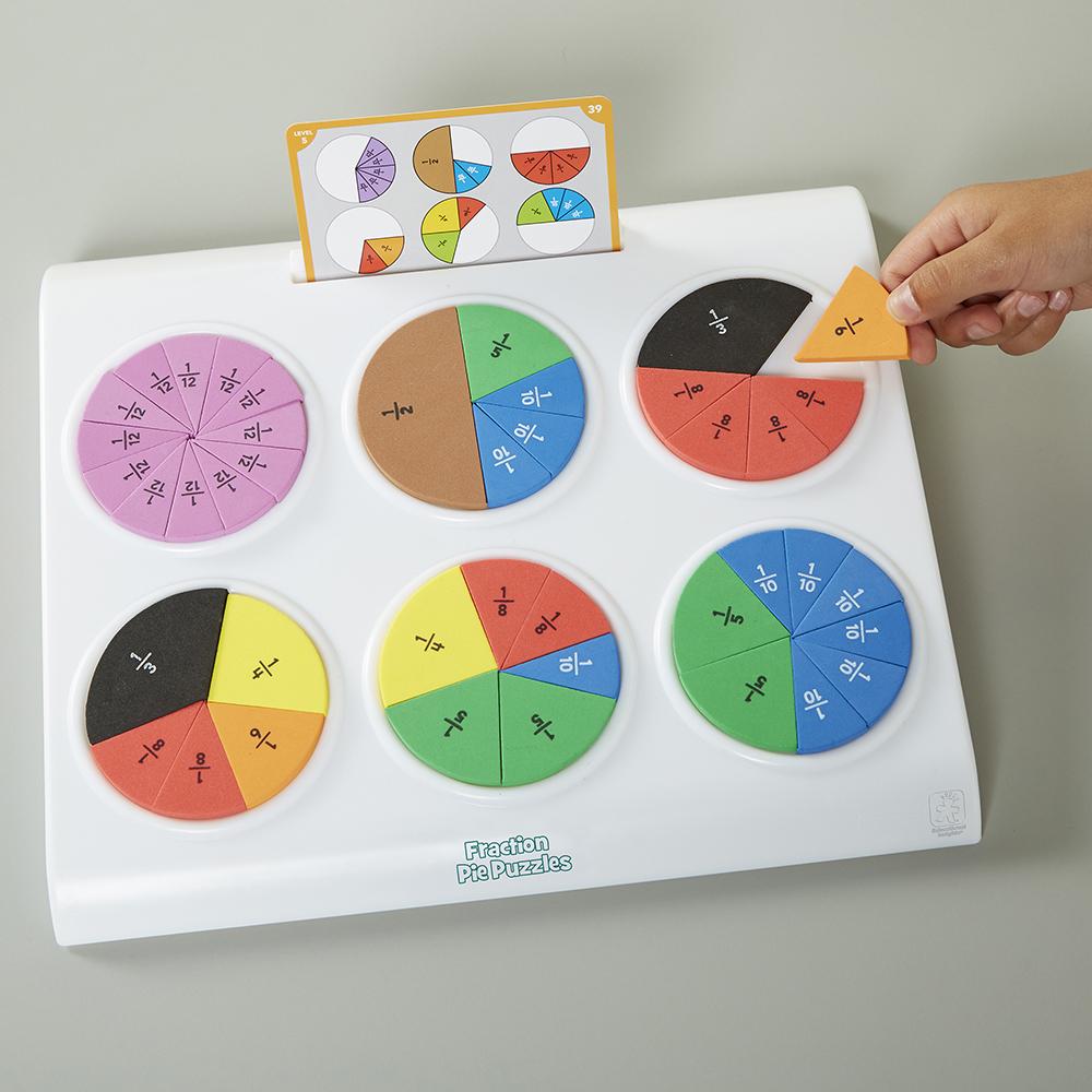 Fraction Pie Puzzles Make fractions as "easy as pie"! Includes game board, 50 puzzle cards and solutions, and 65 foam fraction pieces Two-level puzzle cards teach parts of a whole, equivalencies,...