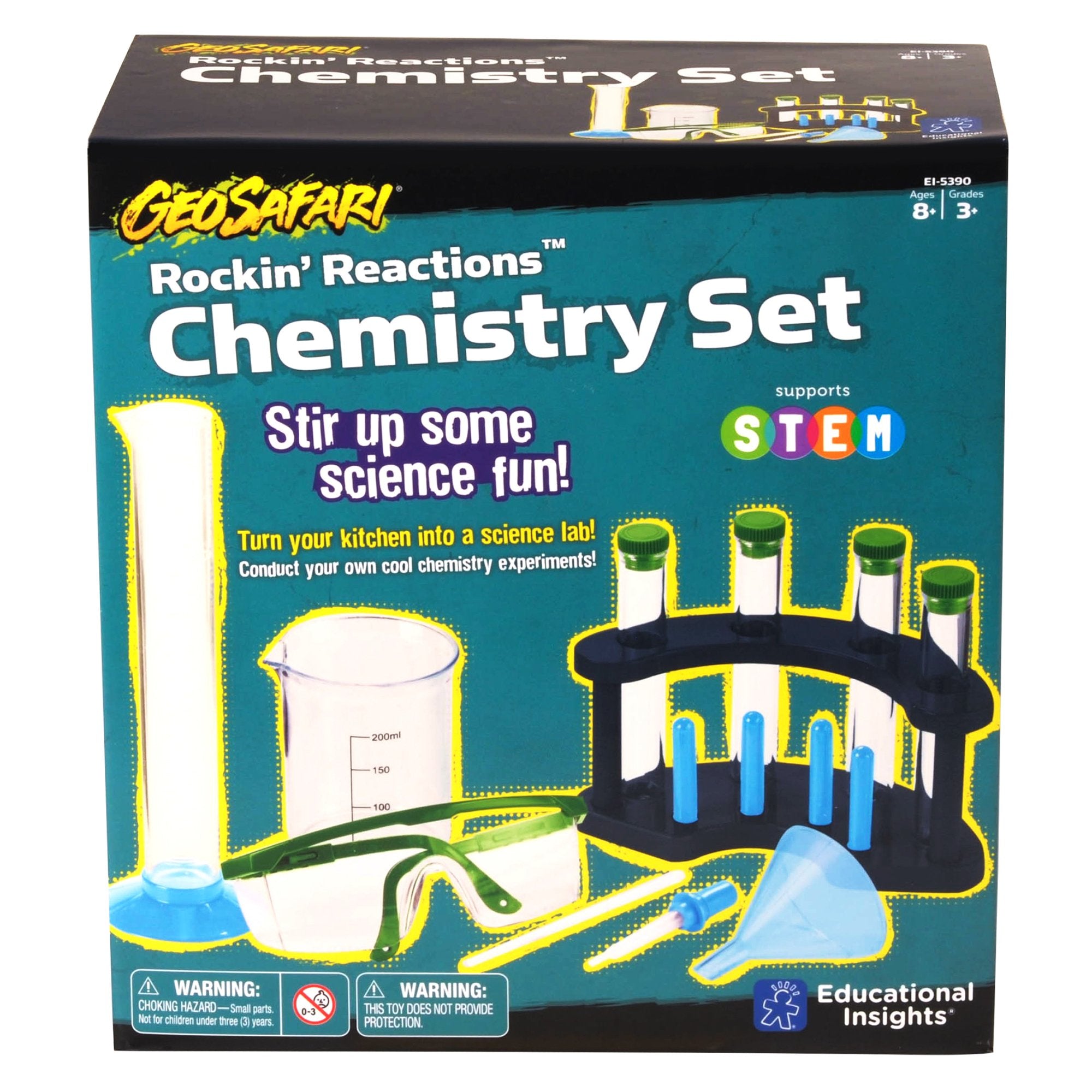 Includes 4 test tubes, rack, beaker, graduated cylinder, lab glasses, dropper, funnel, and stirring rod