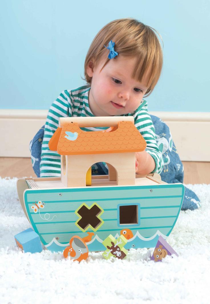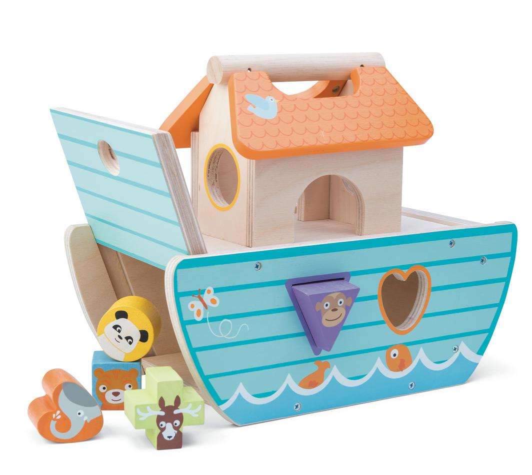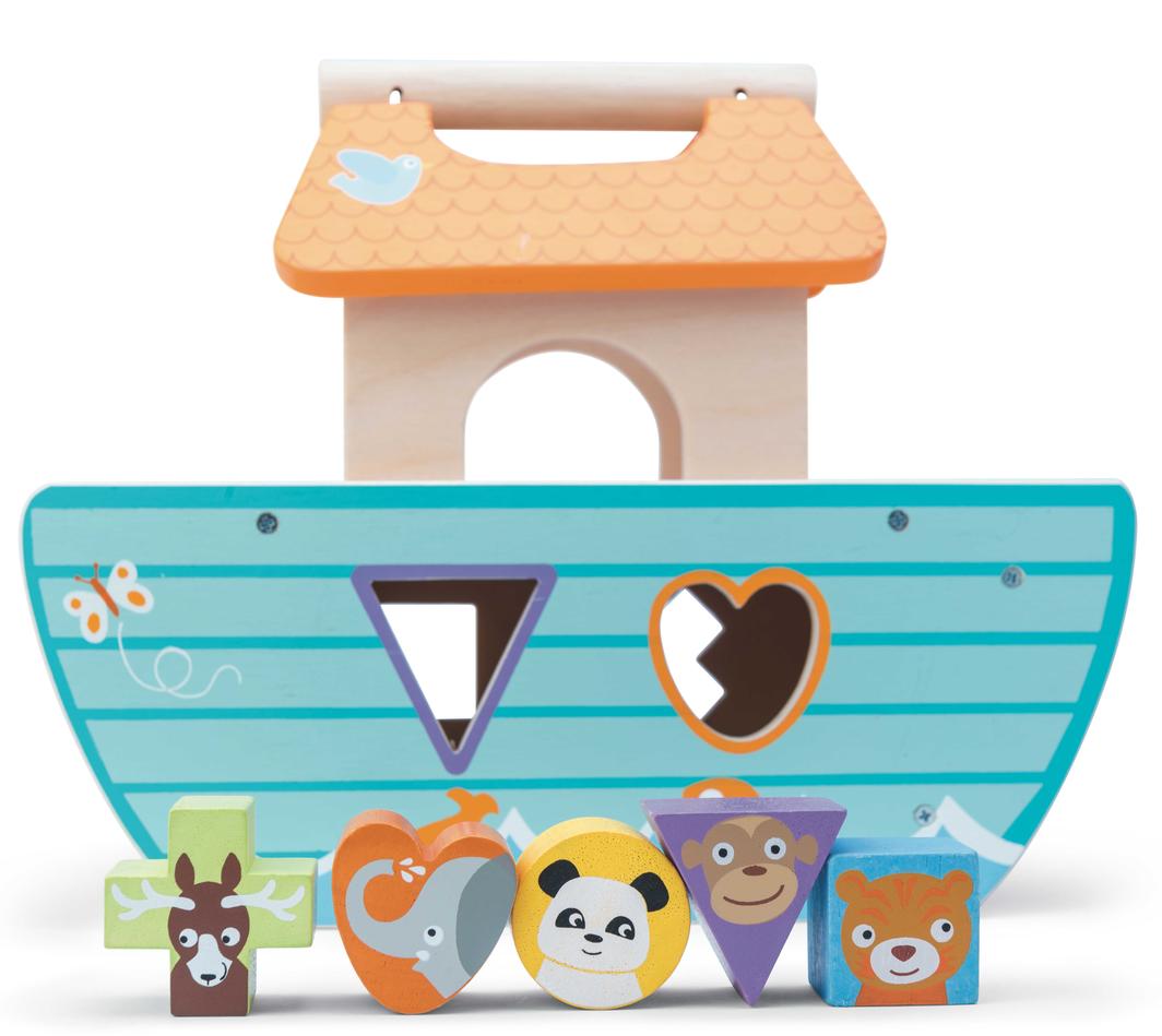 • Wooden shape sorter ark with a carry handle that is ideal for little fingers.