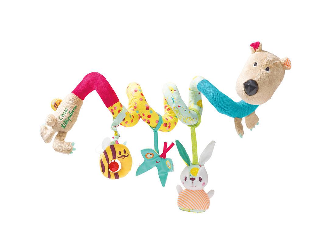César the bear can be wound around the playpen, pushchair or baby seat and has so many activities to keep your baby happy: a bumblebee-bell, a cute butterfly and a little rabbit mirror!