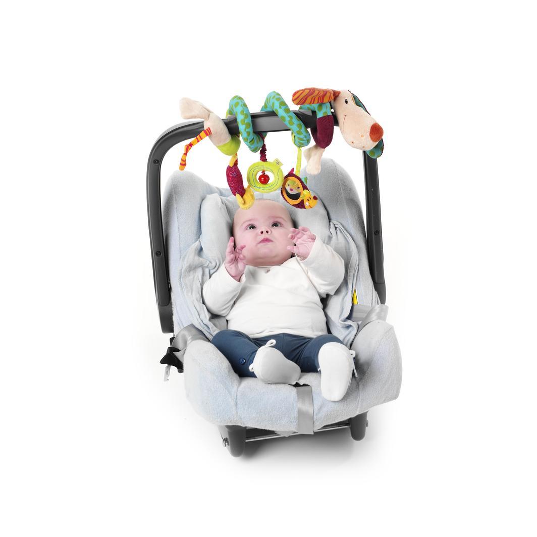 Jef wraps around the playpen, crib or car seat for the amusement of tiny tots. He comes with lots of activities to encourage the sensory development of babies.