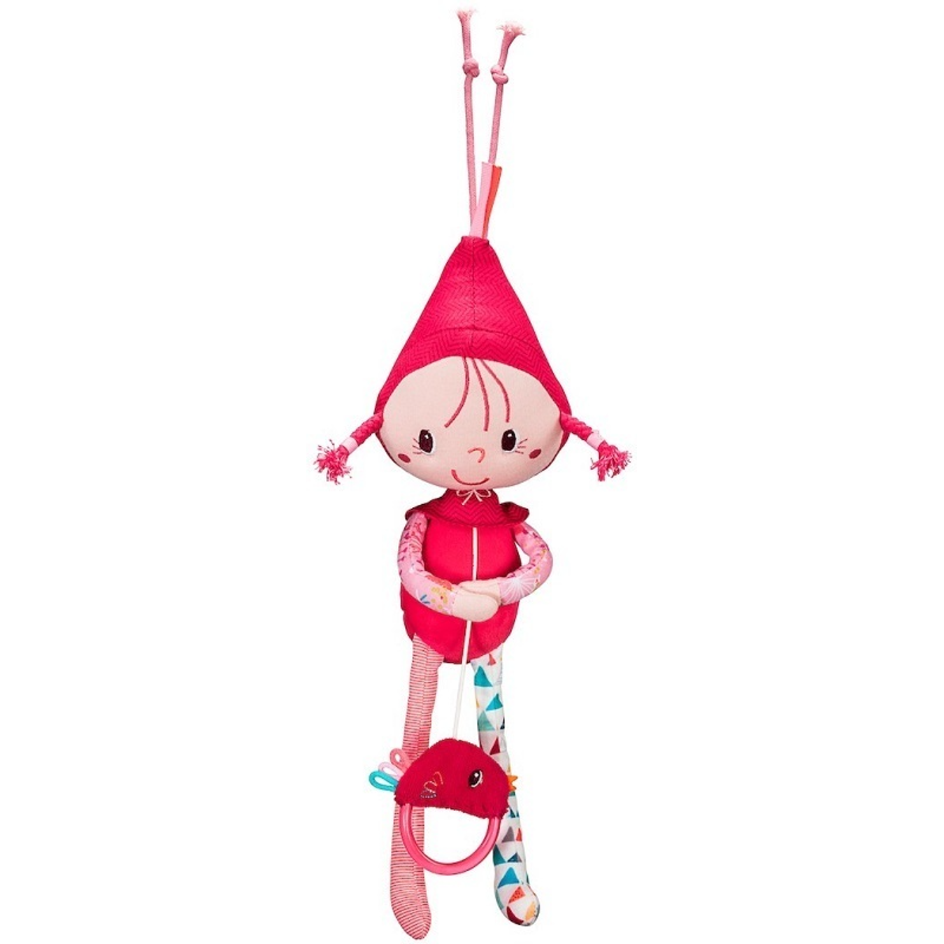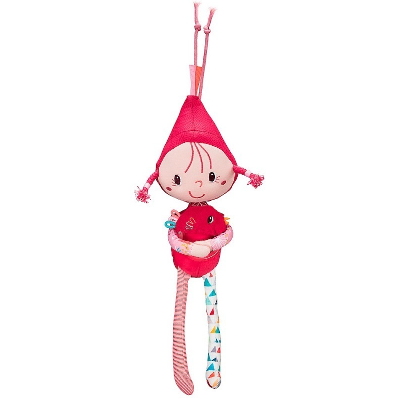 Made of many printed fabrics, this beautiful doll featuring the Red Riding Hood sings the sweet melody "Over the Rainbow" when you pull on the string. The little bird nestles against the doll at the end of the song. Ideal gift for baby's first nights.