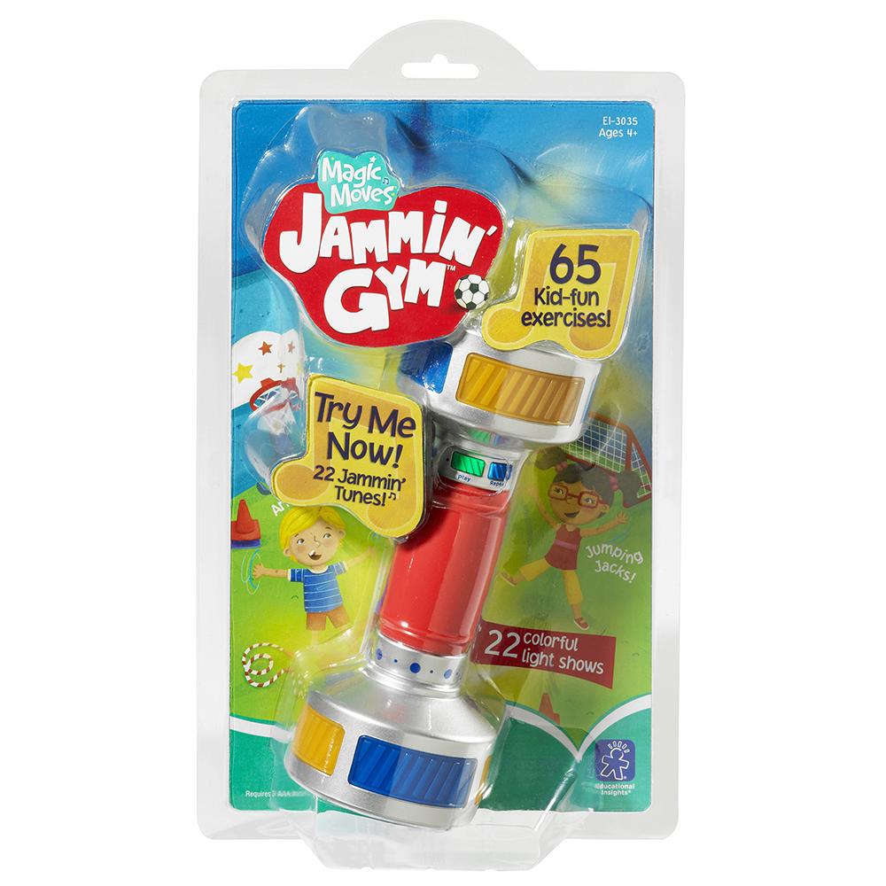 Jammin' Gym takes pint-sized workouts to a whole new level with flashing lights, catchy music, and fun exercise commands. Shaped like a simple free weight, with flashing lights and catchy music, it's designed to get kids working out in a fun way. Commands range from jumping jacks and arm curls, to "Let's Surf" and "Dance Party."
