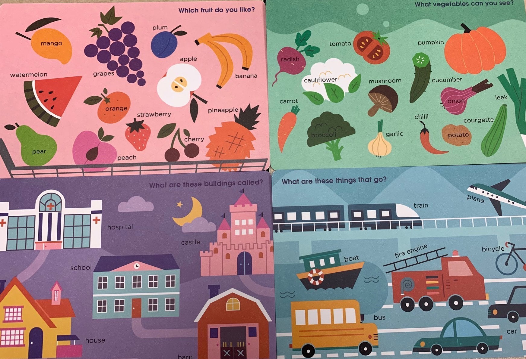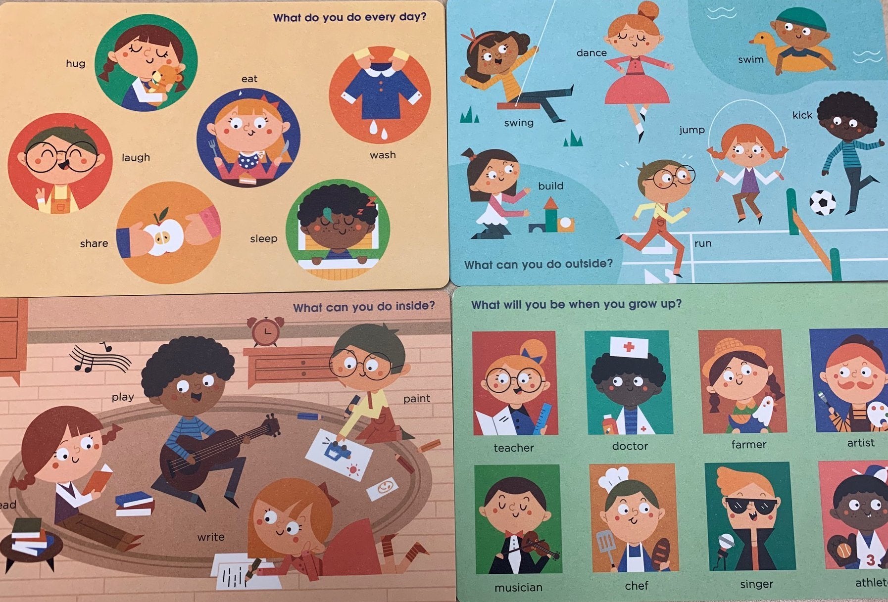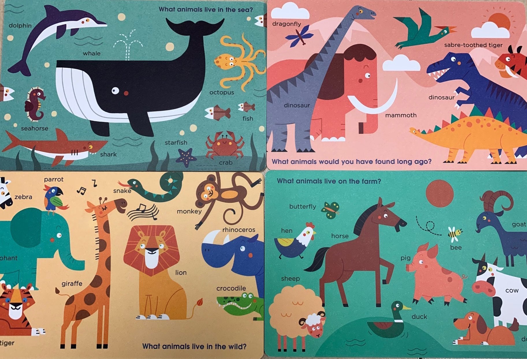 Learn which animals live in the sea, in the wild or on the farm. Four cards about things you do in the world. What do you do inside and outside? One card all about fruits; one card all about vegetables; one card about buildings; one card about transportation.