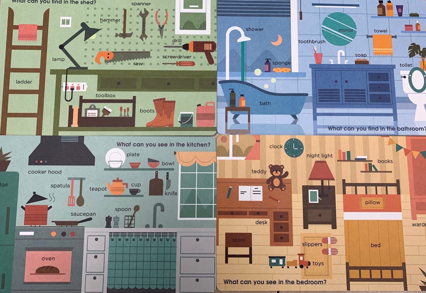 A set of 16 flash cards to learn about the world around you. Four cards are all about your home and the objects you can find in your kitchen, shed, bathroom and bedroom. Four Cards about animals.