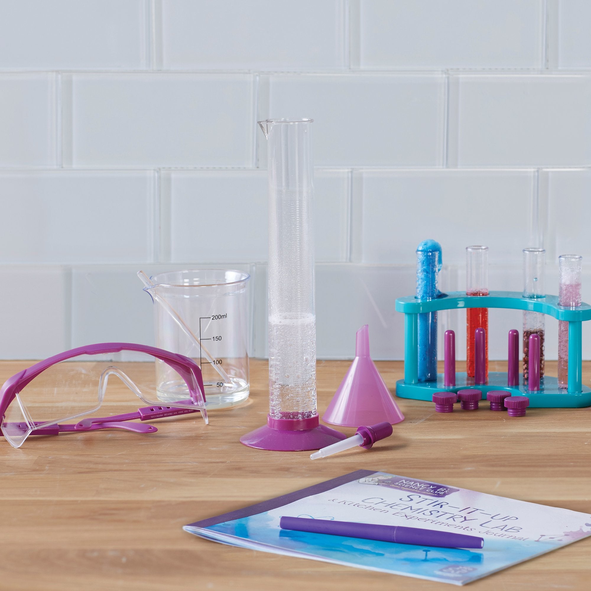 Junior chemists can safely explore simple scientific principles including extinguishing a flame with invisible gas; making their own bubbling "lava" in a bottle; causing chemicals to change color; and more. Set includes essential lab equipment including: beaker, test tubes, goggles, and more. The journal is filled with experiments utilizing common household ingredients PLUS opportunities for young scientists to write, draw, and think about their discoveries.