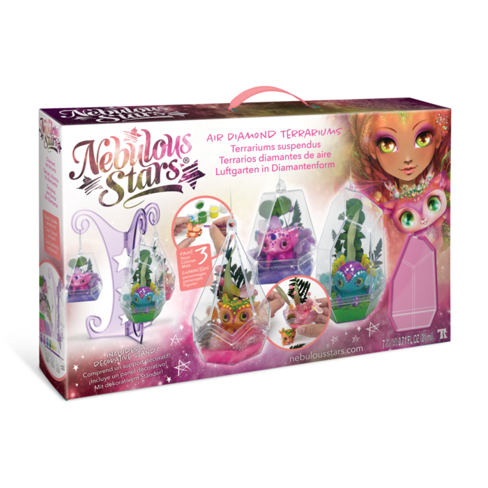 Create and enjoy your own beautiful customized decorative air garden with painted Nebulous Stars friends! Contents: 3 diamond-shaped terrariums Decorative stand 3 ready-to-paint figurines 6 colors of acrylic paint Glitter varnish...