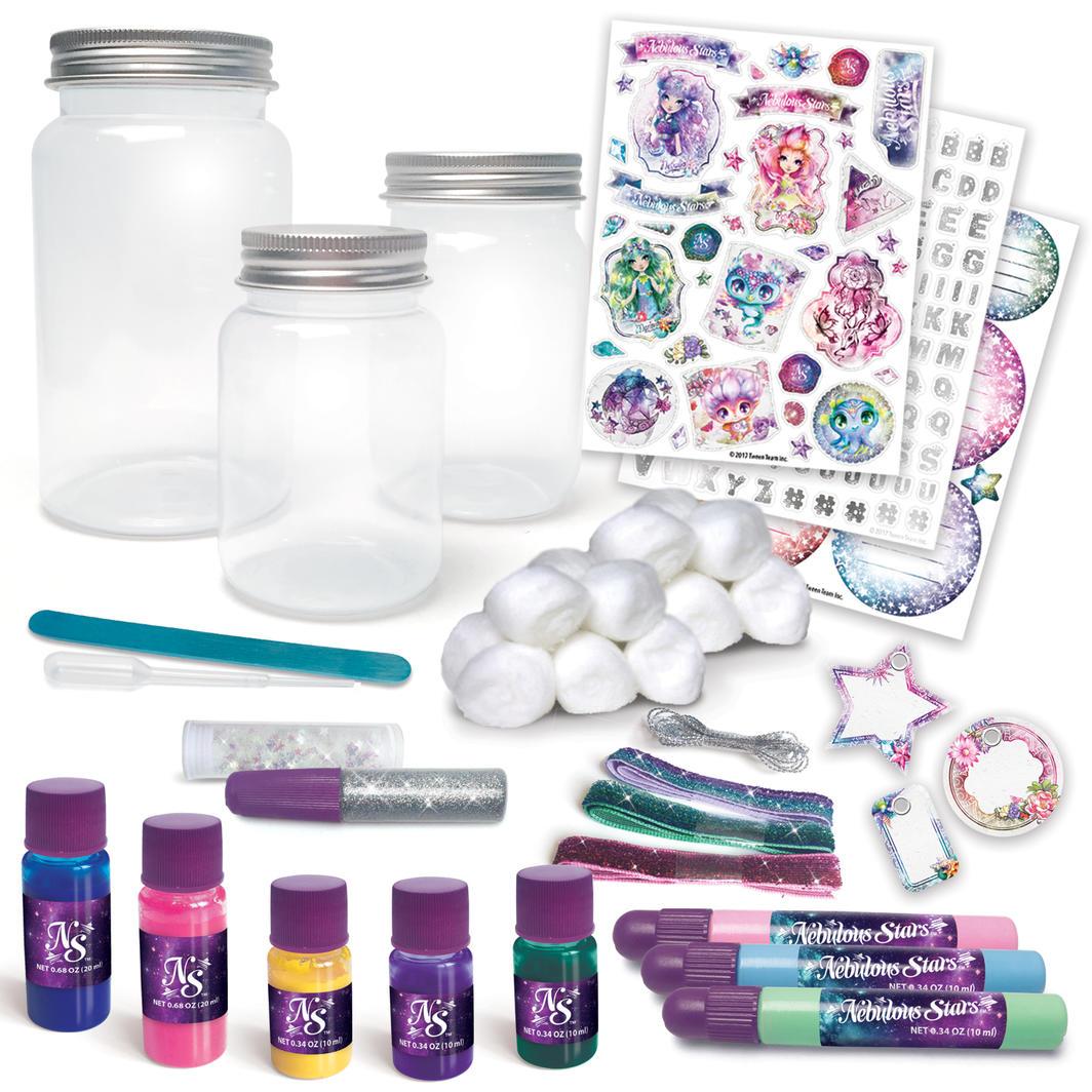 Large plastic jar with metal cap (450 ml),Medium plastic jar with metal cap (250 ml), Small plastic jar with metal cap (150 ml), 6 ink colors in drop bottles, Glow in the dark paint tube, Glitter powder tube,Star shaped sequin tube, 41 color stickers,133 metallic alphabet stickers,6 wish cap stickers, 3 cardboard decorative tags, 3 glitter ribbons,Cotton balls (170 g),Color instructions,Nebulias story pamphlet.
