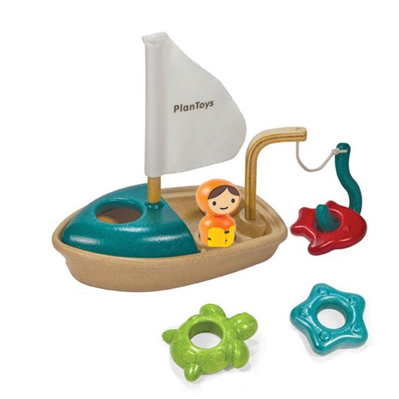 • Contents: a wooden boat with a removable cabin, detachable fishhook, sail, fisherman, fish, starfish, and a turtle