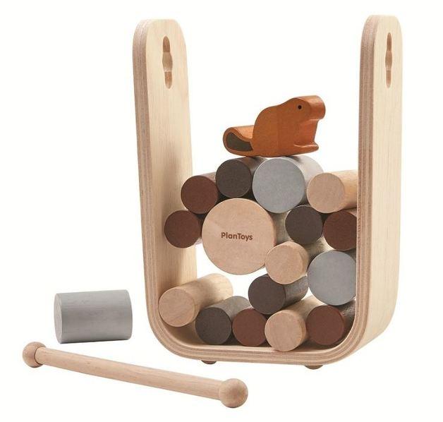 Save the beaver to win the game! Start off by adding all the logs to the u-shaped container, then pop the beaver at the top. Using the wooden stick, take it in turns to push out one of the wooden logs and gradually lower the beaver from top to bottom, but without letting the beaver fall out forwards or backwards!