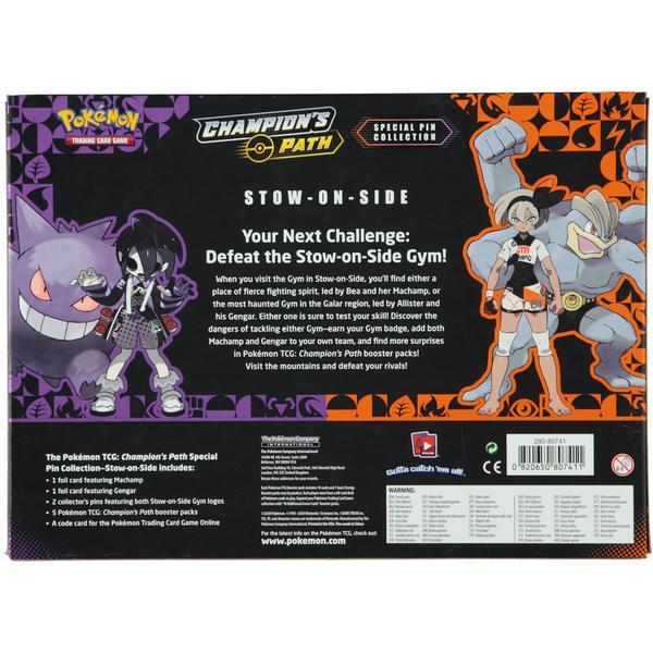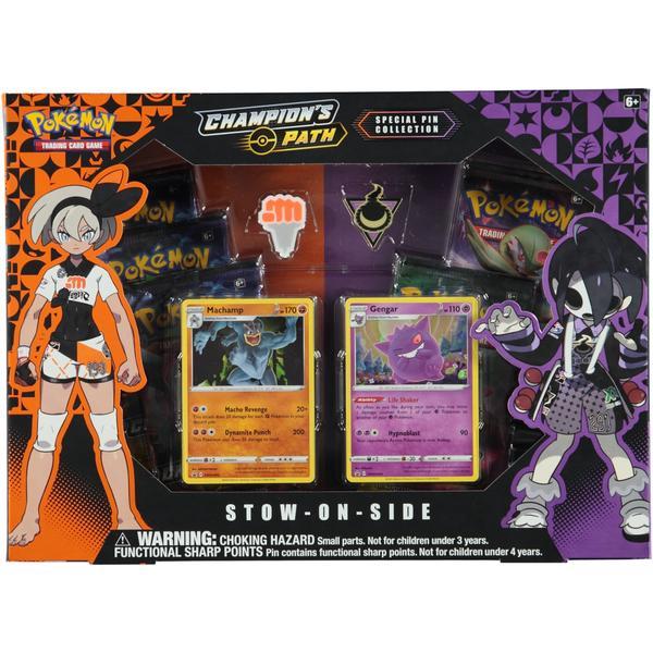 Celebrate your Pokémon Trainer Journey with a Champion's Path Special Pin Collection! When you visit the Stow-on-Side Gym, you might step into one of two completely different Gyms, each with a different challenge, a different Pokémon type focus, and even a different Gym Leader—and the same goes for the Circhester Gym! This awesome collection features two collector's pins with both of that Gym's logos, foil cards featuring the partner Pokémon of both Gym Leaders, and five booster packs from the special Champion's Path expansion. Continue your journey and defeat your rivals!