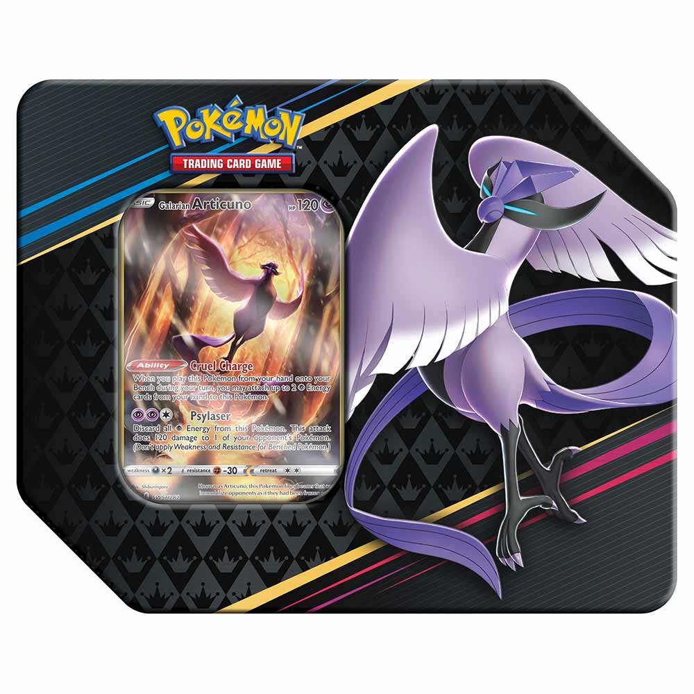 Three fearsome Legendary Pokémon have arrived from the Galar region in a trio of Pokémon Trading Card Game tins. With their own unique type and powers, Galarian Articuno, Galarian Zapdos, and Galarian Moltres are forces to be reckoned with. Add their power to your Pokémon TCG collection and see for yourself!