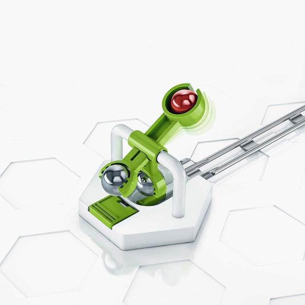 Keep your marble run excitement going with the scoop. Triggered automatically when the marble rolls into it, The scoop picks up the marble, swings like a trebuchet and propels the marble down the track of the next highest level. This accessory also includes 6 additional tracks and must be combined with the GraviTrax starter set.