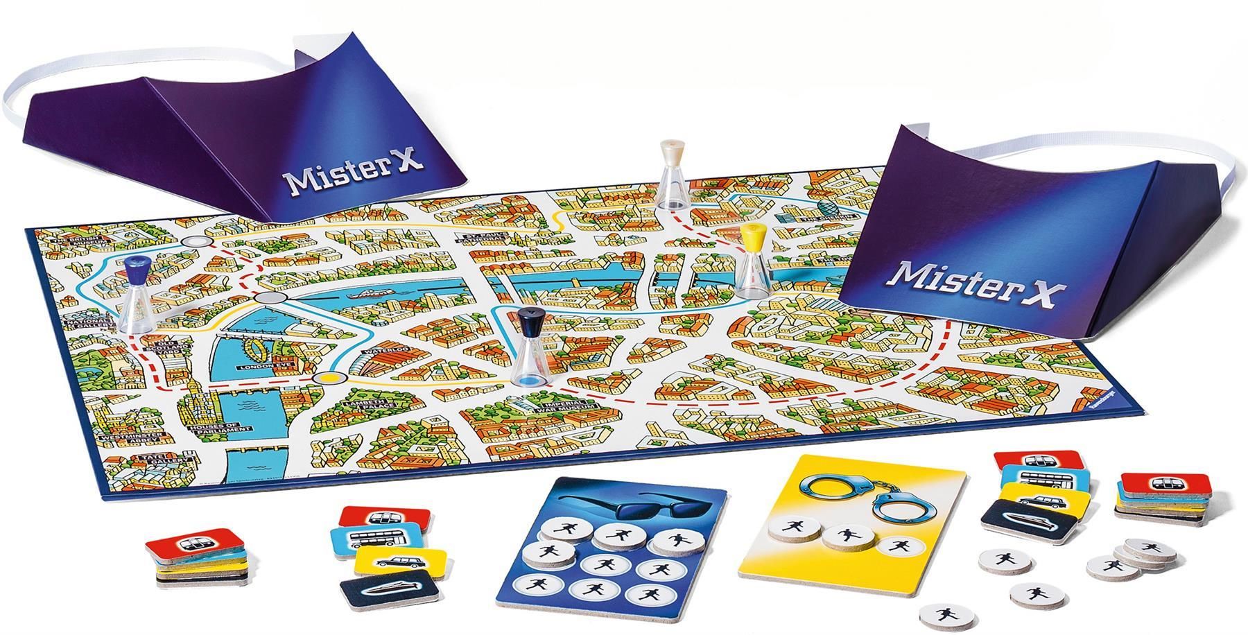 • Contents: 1 Game board, 4 Playing figures, 16 Tickets, 12 Success markers, 2 Side boards, 2 Mister X visors, Rules