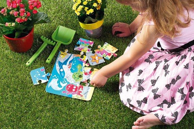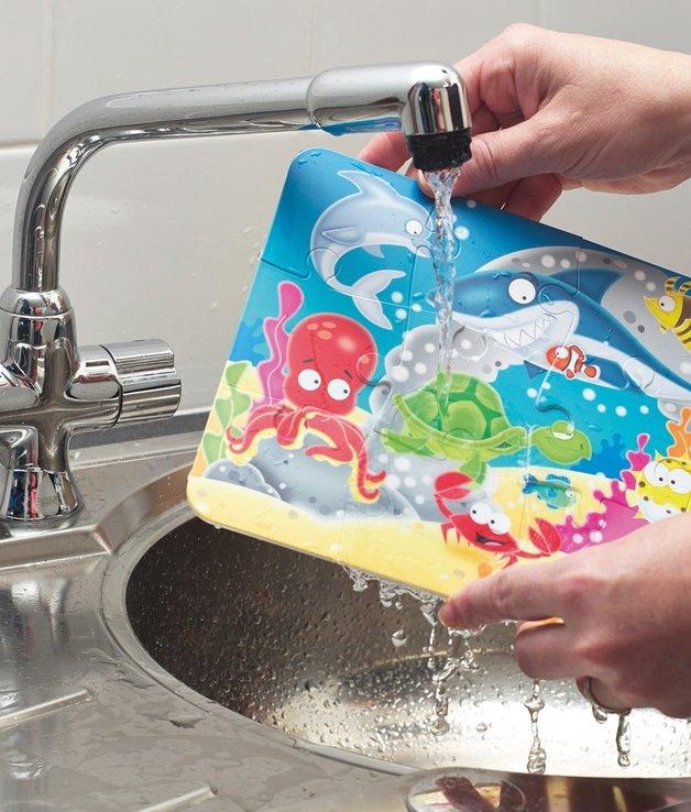 Waterproof Plastic Puzzle The Ravensburger plastic puzzle is perfect for little children! With 12 strong plastic pieces it can be taken to a restaurant a friends house or even puzzled outside! When the puzzling stops it can be wiped clean over and over again.