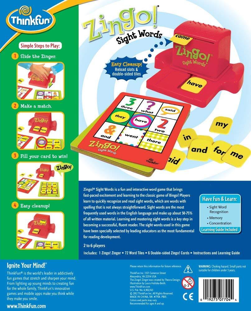 Zingo! Sight Words is a fun and interactive word game that brings fast-paced excitement and learning to the classic game of Bingo! Players learn to quickly recognize and read sight words, which are words with spelling that is not always straightforward. Sight words are the most frequently used words in the English language and make up about 50-75% of all written material. Learning and mastering sight words is a key step in becoming a successful, fluent reader. The sight words used in this game have been specially selected by leading educators as the most fundamental for reading development.
