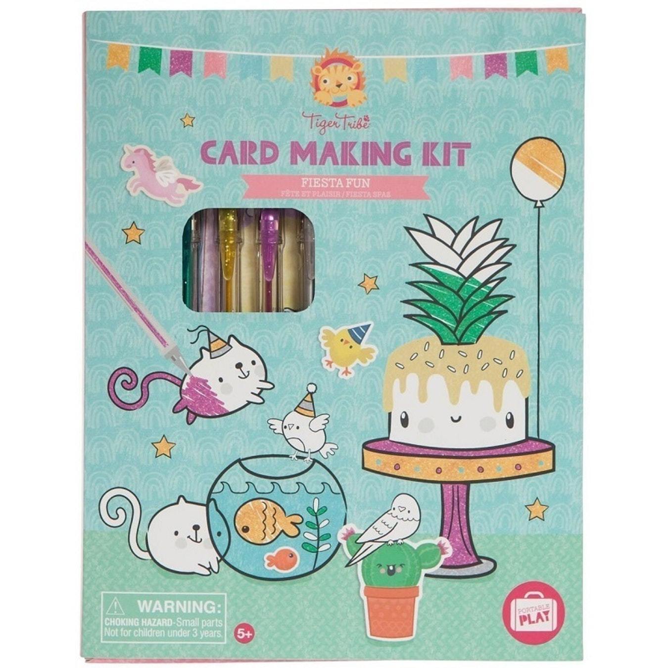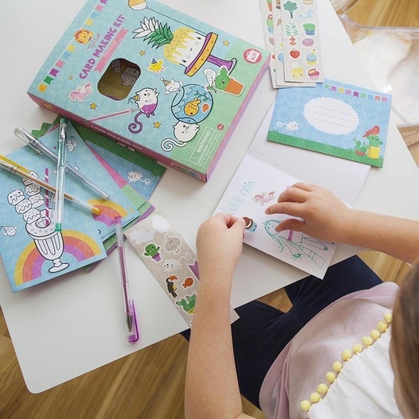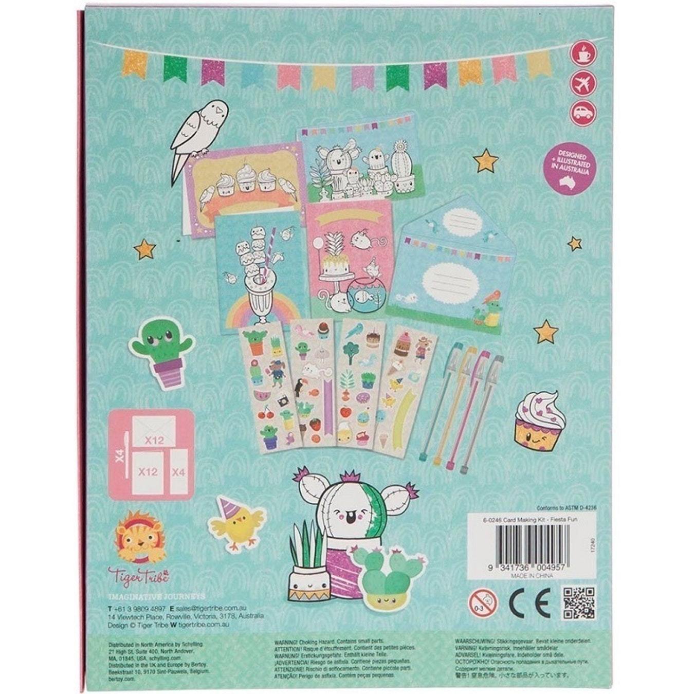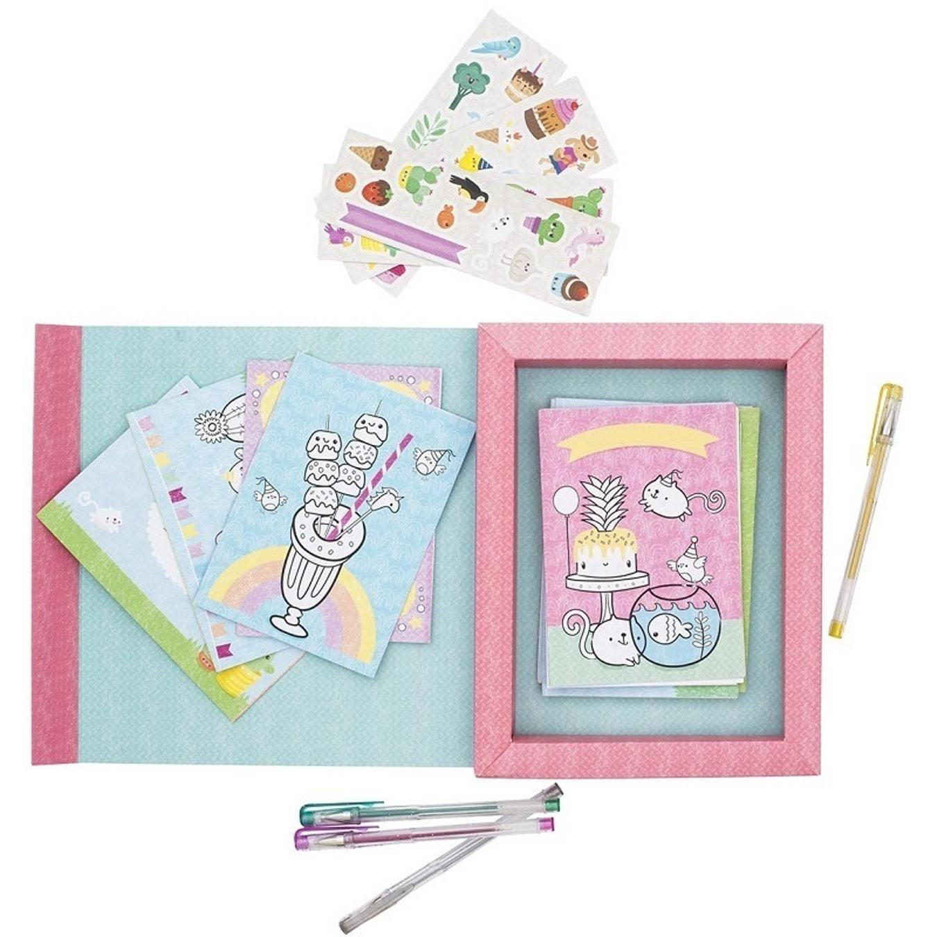 Contents: 12 printed cards, 12 printed envelopes, 4 glitter gel pens, 40+ colour stickers, storage box