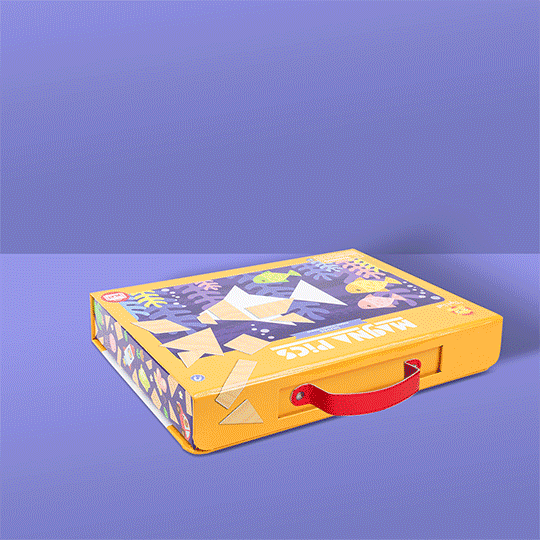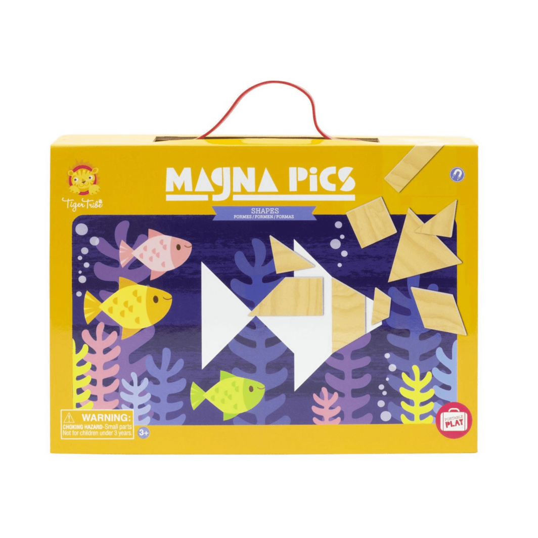 A modern take on the classic tangram puzzle. The task at hand? To arrange the magnetic tangram-style shapes to fit the blank spaces, in the form of a butterfly, a boat, a fish and so many more.