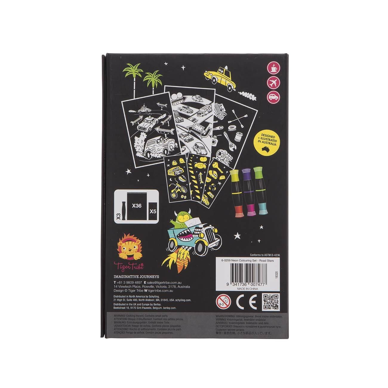 - Each Neon Colouring Set contains: 36 colouring in pages, 5 sheets of stickers, 3 double-ended neon markers, handy storage box
